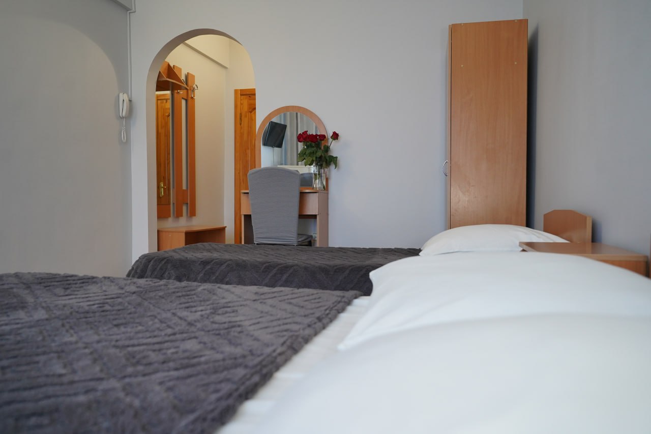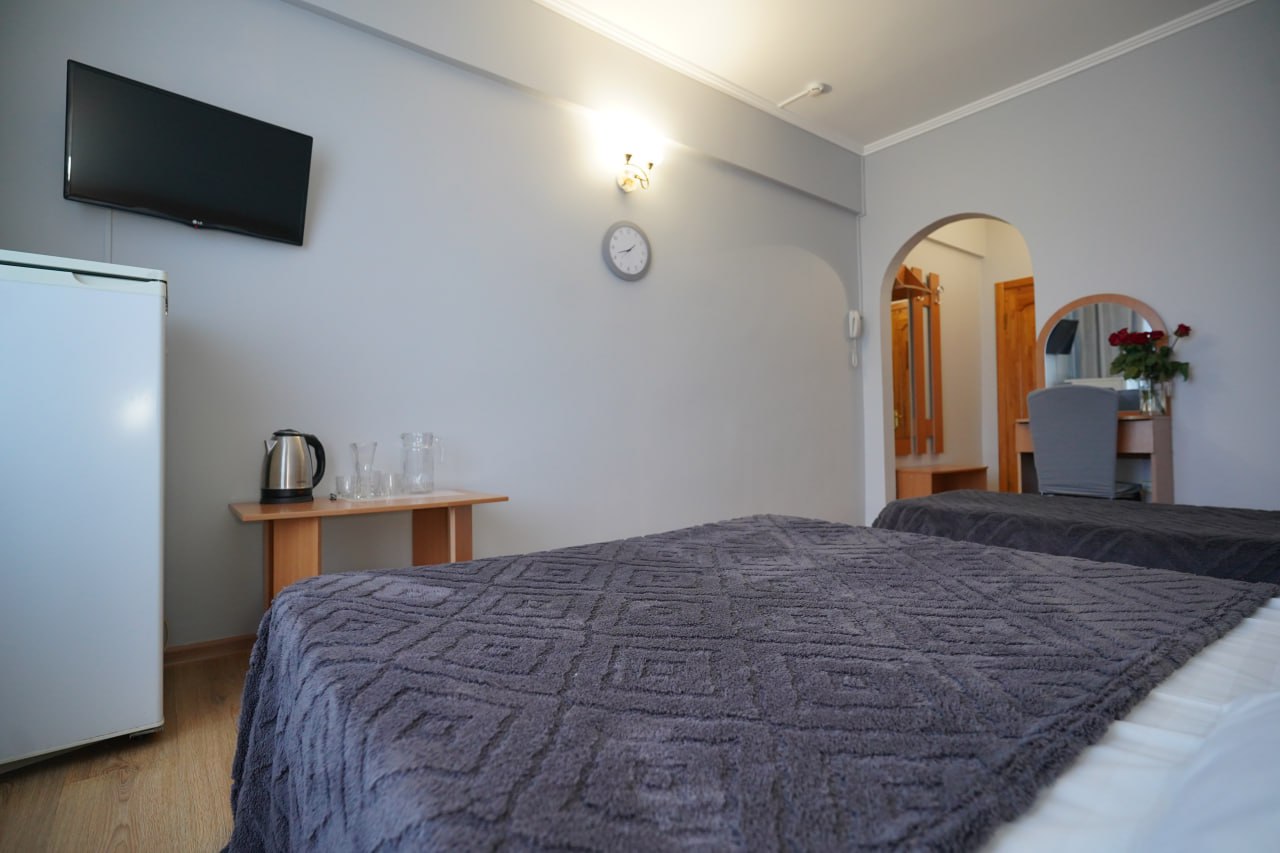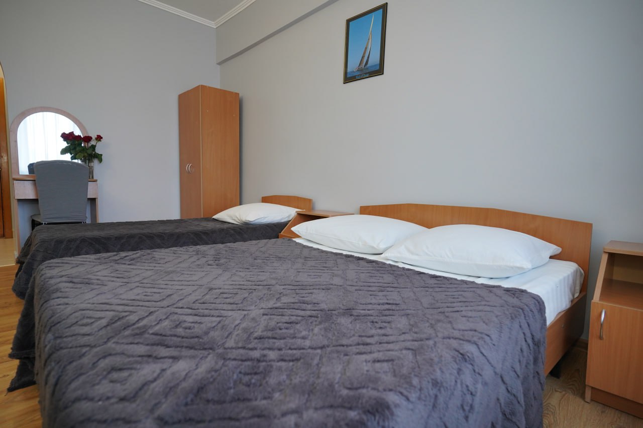 Комната оснащена всем необходимым и отвечает запросам требовательных отдыхающих. Окна направлены в противоположную сторону от автовокзала, на частный сектор. Кровати: односпальных 1, двуспальных 1; сплит система (холод/тепло); санузлом + (душ или ванная); телевизором; холодильником; бесплатным интернетом.